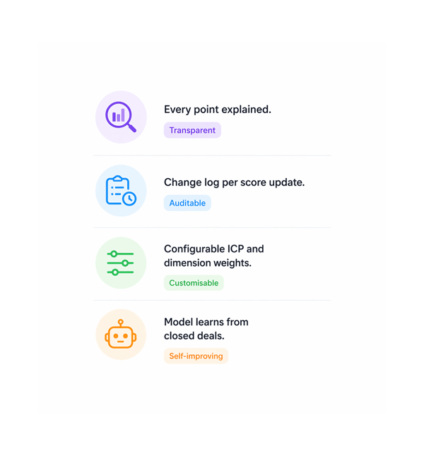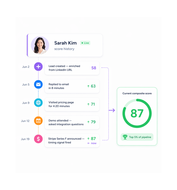 Scores adapt as leads move through different pipeline stages. Context aware intelligence that understands where each prospect sits in your process.
