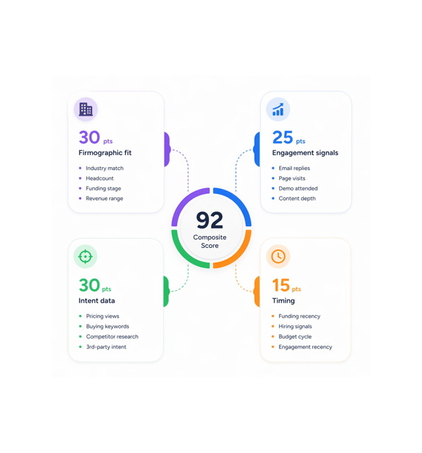 Every lead receives a 0 to 100 composite score from firmographic fit, engagement signals, intent data, and timing updated automatically as the lead evolves through your pipeline.