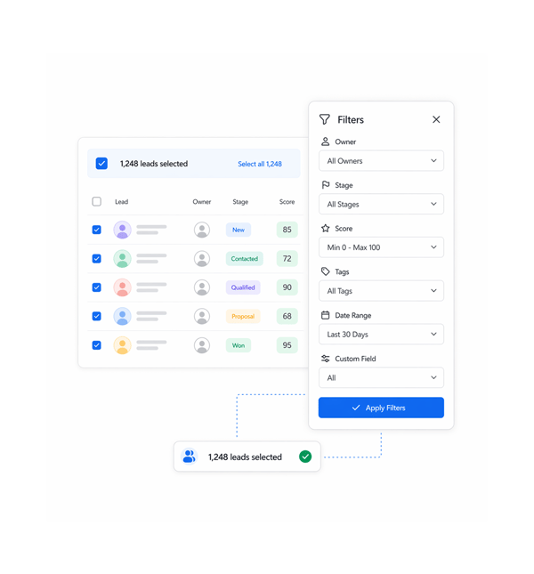 Target leads precisely with complex filtering by owner, stage, score, tags, dates, or custom criteria. Select exactly the records that need updates.