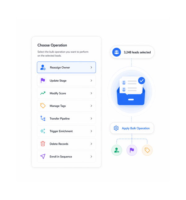 Select thousands of leads and update owner, stage, score, or tags in one click. Reassign pipelines, trigger enrichment, delete stale records, or push to sequences without ever touching a lead one at a time.