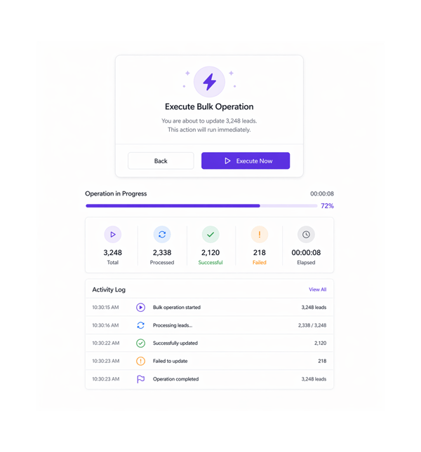 Apply updates to thousands of leads with a single click. Real-time progress tracking shows completion status while comprehensive logging records all changes for audit and rollback capabilities.