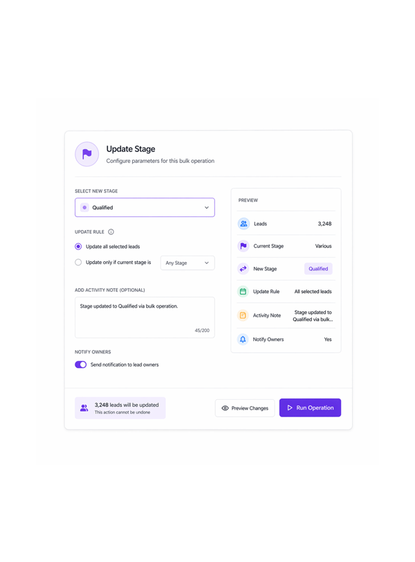 Select thousands of leads with advanced filters, choose your bulk operation, configure update parameters, then execute changes across your entire pipeline with one click.