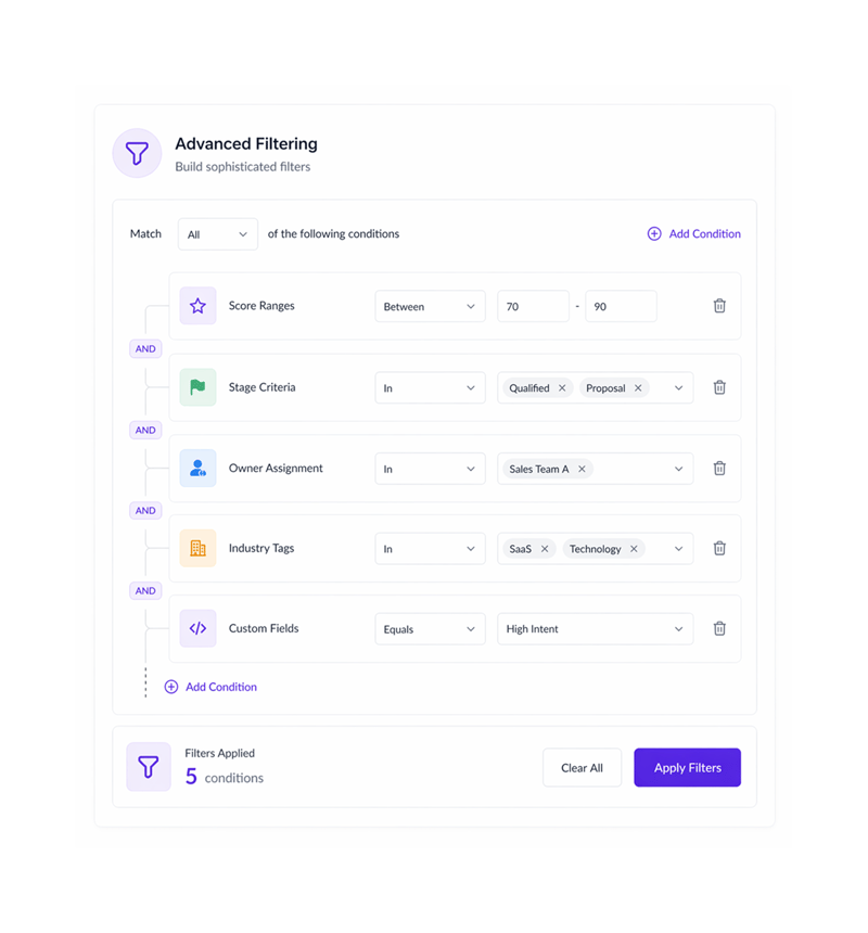 Create complex filters combining score ranges, stage criteria, ownership, industry classifications, intent signals, custom fields, and date ranges. Stack multiple conditions with AND/OR logic.