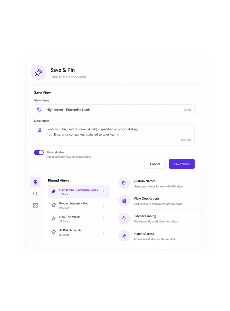 Build saved views filtered by score, stage, owner, industry, intent, or any custom field. Share views across the team, pin your top queries, and switch between list, kanban, or table layouts in one click.