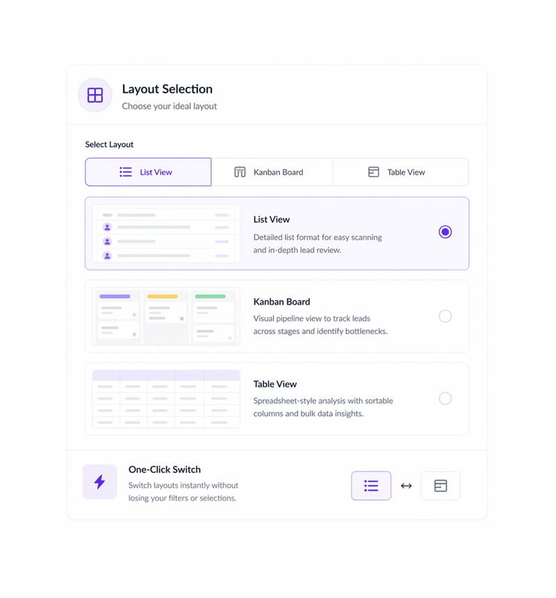 Switch between list view for detailed scanning, kanban boards for pipeline visualization, or table view for spreadsheet style analysis. Each layout optimized for different workflows.