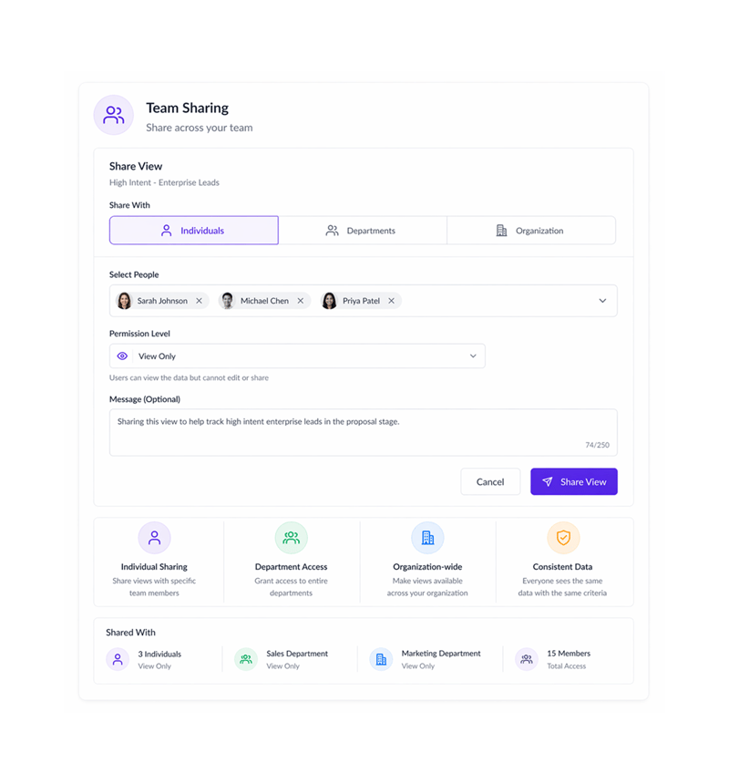 Shared views ensure everyone on your team sees leads with the same criteria, reducing confusion and improving coordination.
