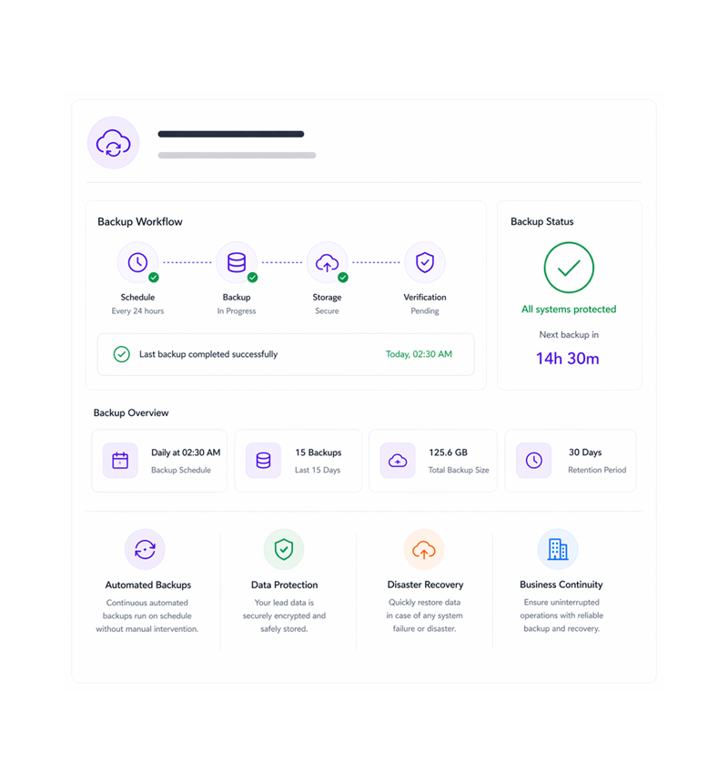 Establish automated backup workflows for continuous data protection and disaster recovery preparedness. Automated backup ensures your valuable lead data is consistently preserved and recoverable while maintaining business continuity and data security.