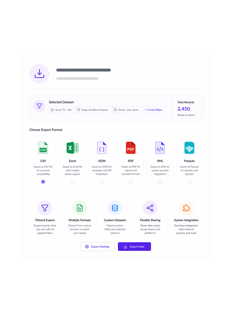 Export filtered datasets to multiple formats including CSV, Excel, and various other formats based on your specific requirements. Multi format export capabilities enable flexible data sharing and integration with different systems and tools.