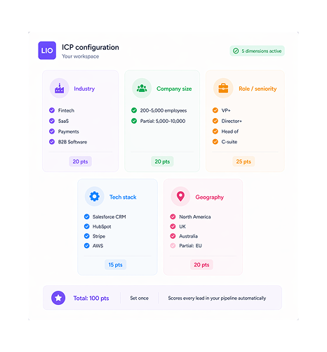 Sales reps, sales managers, and marketing teams all use LIO's ICP scoring as the shared qualification layer for lead prioritization. The ICP is the standard. The score is the fit. The breakdown is what makes it actionable because a score only every team member trusts is a score every team member actually uses.