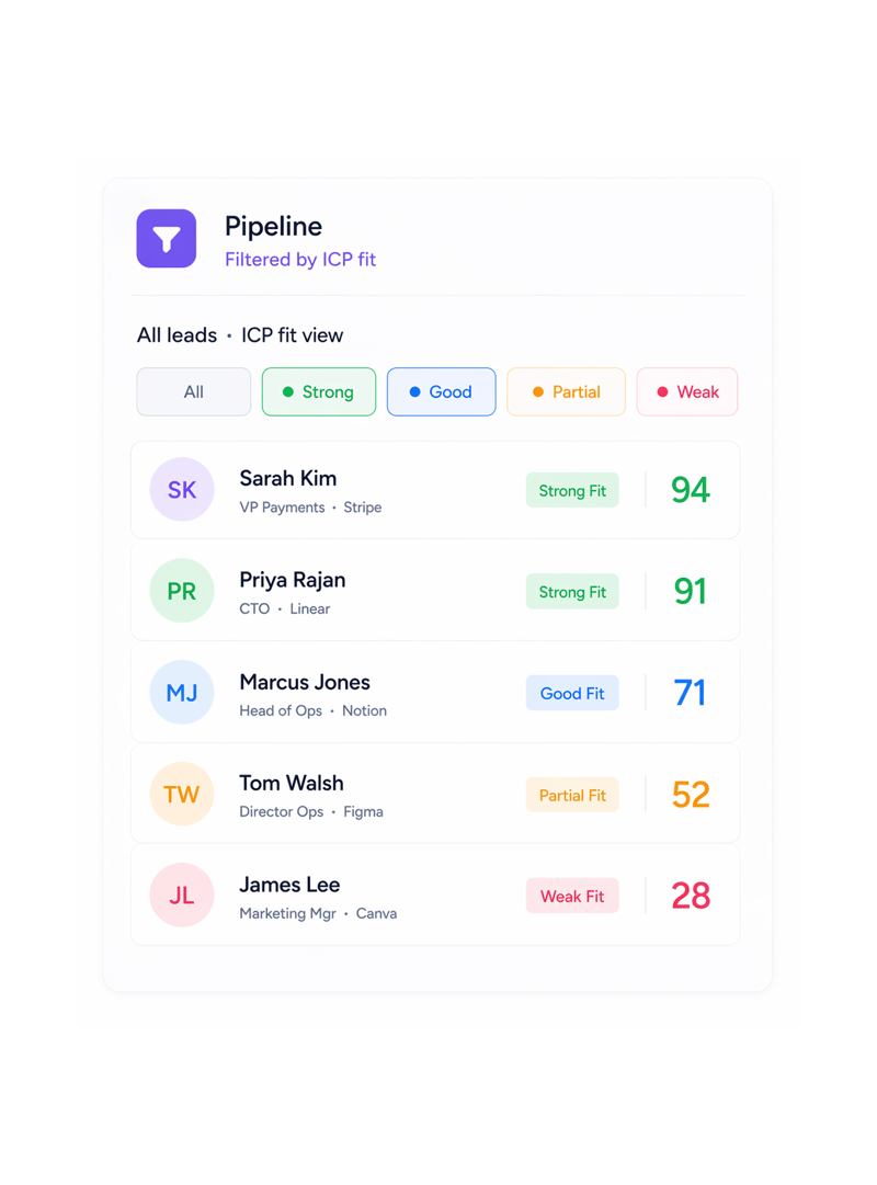 Receive detailed scoring breakdowns showing how each lead performs against ICP criteria. Reps instantly know which prospects deserve attention and why, enabling focused effort on qualified opportunities.