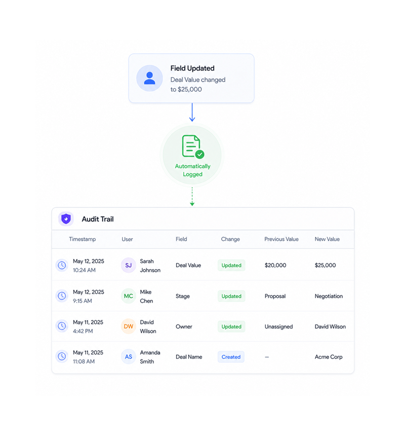 Every change logs automatically with timestamp, user, and field details. Complete audit trail ensures compliance and accountability without manual work.