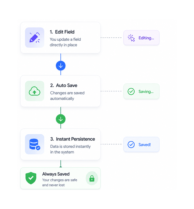 Changes save automatically without page reload, manual save buttons, or confirmation dialogs. Instant persistence ensures data is never lost.