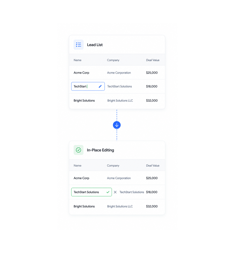 Click any field in lead lists, pipeline views, or detail screens to edit directly in place. No modals or navigation required for seamless editing experience.