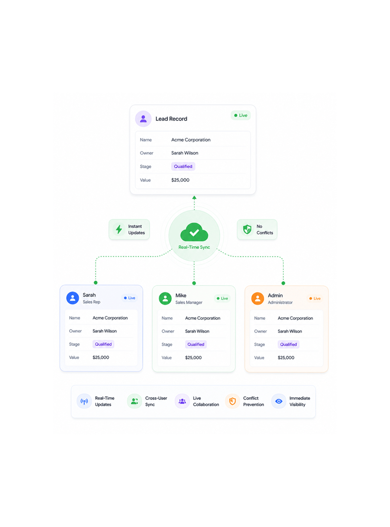 Updates sync instantly across every user viewing the same data. Real time collaboration prevents conflicts and ensures immediate visibility of changes.