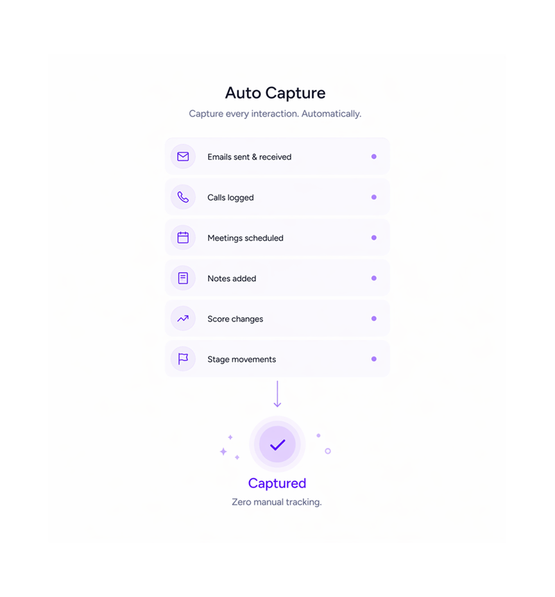 Automatically log emails, calls, meetings, notes, score changes, and stage moves without manual input. Complete activity tracking across all systems.
