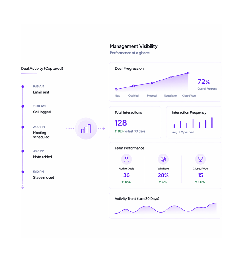 Managers audit deal history without pinging team members for updates. Complete visibility eliminates status meetings and interruption based communication.