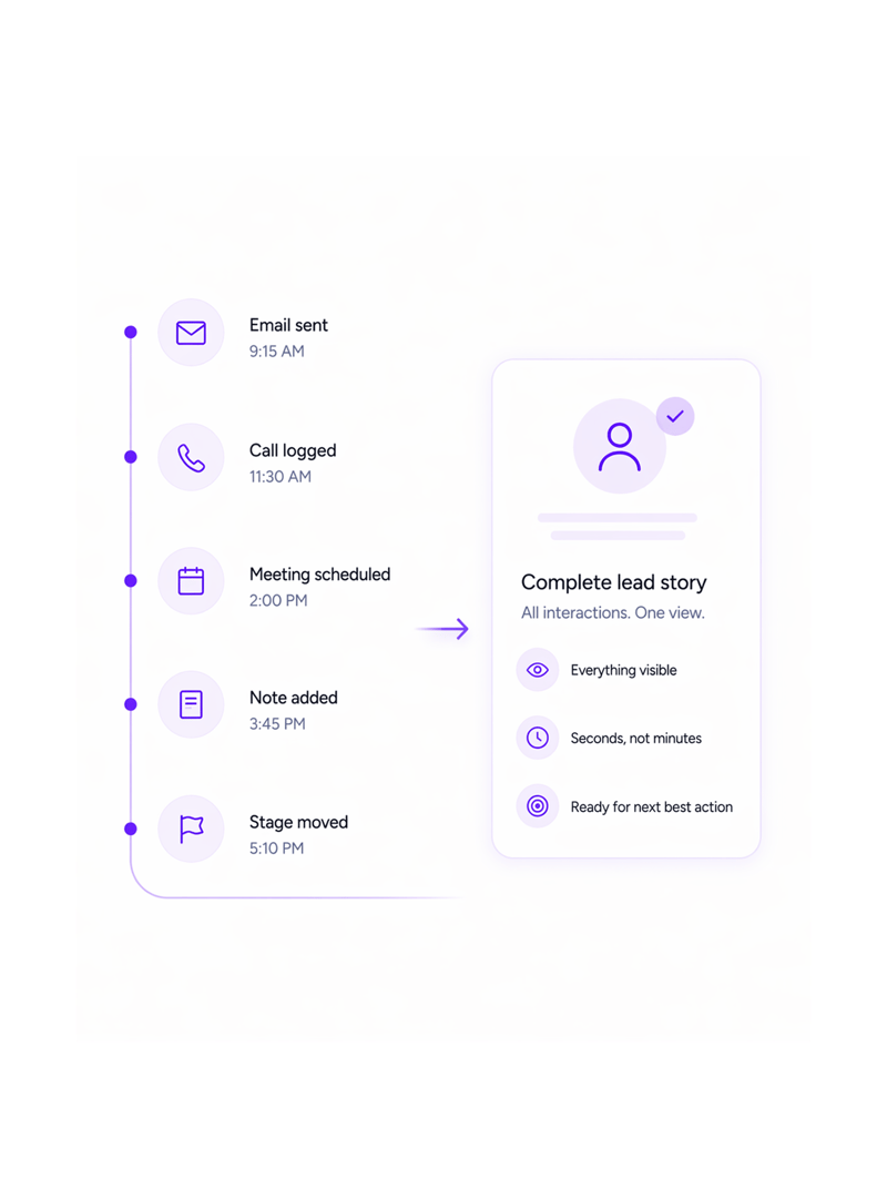 All activities organized in one timeline showing the complete lead journey. No jumping between systems or piecing together scattered information from multiple sources.
