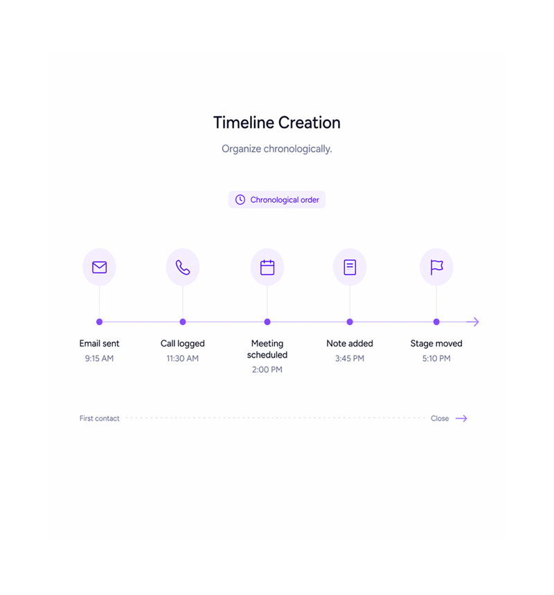 Every email, call, meeting, note, score change, and stage move logged on a single chronological feed. Reps see full context in seconds and managers audit deal history without pinging anyone for a status update.