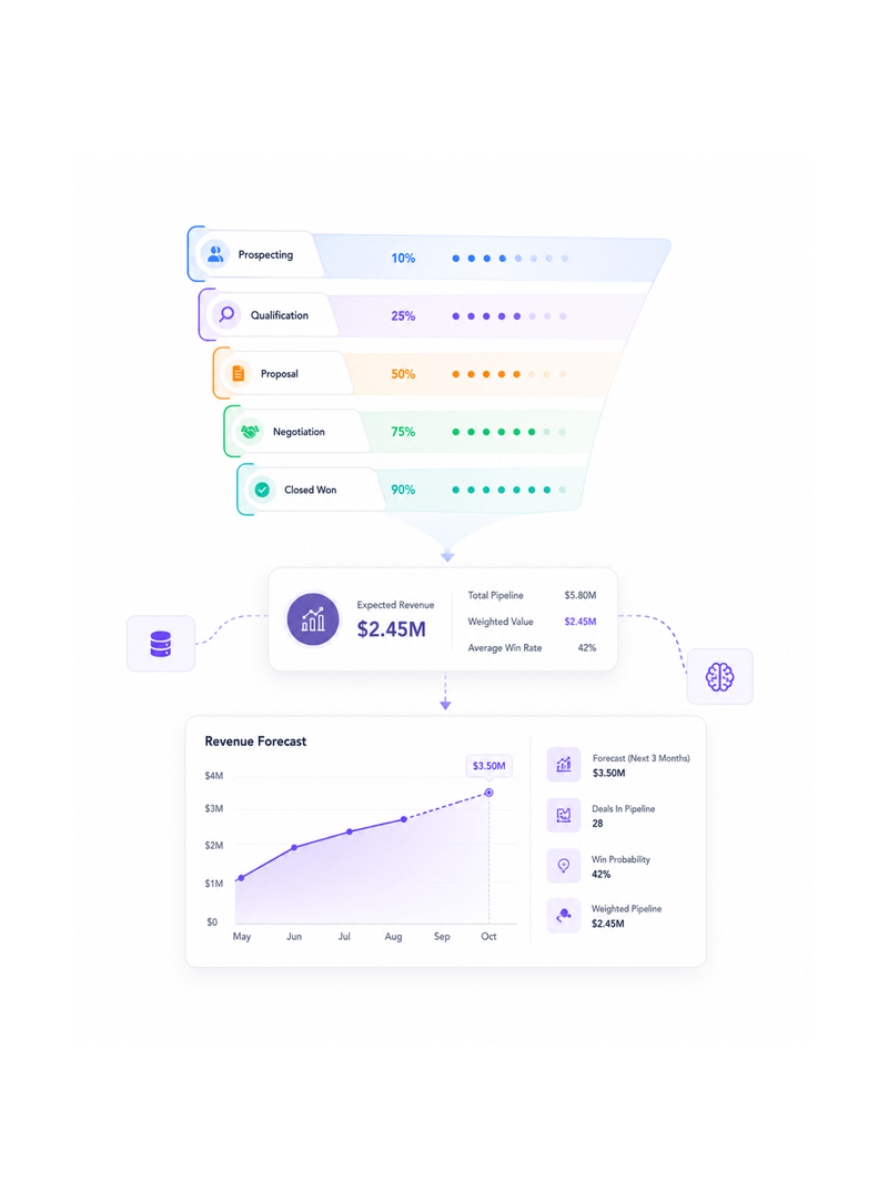 Configure probability weights for each pipeline stage to enable accurate revenue forecasting and realistic sales predictions. Probability weighting provides data driven insights into deal likelihood and expected outcomes while supporting strategic decision making through statistical analysis and predictive modeling.