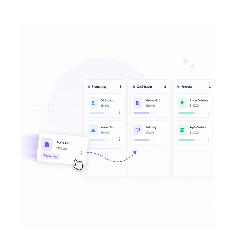 Create interactive pipeline boards with visual stage layouts, implement drag and drop stage management for effortless deal progression, apply probability weighting for accurate forecasting, then generate strategic revenue forecasts for informed planning.