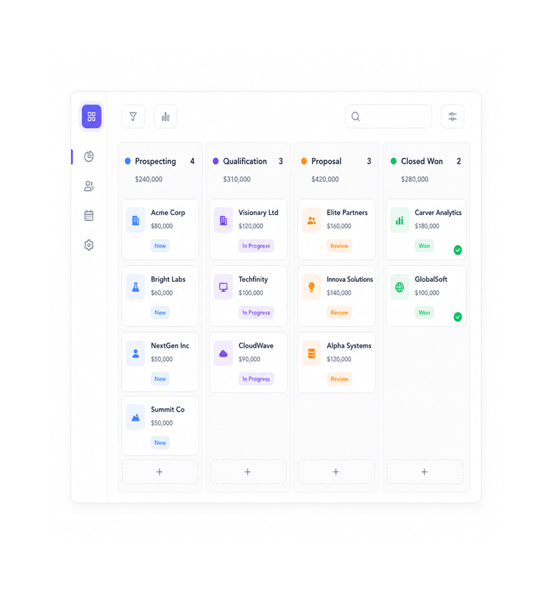 Display deal progression through visual stage layouts with comprehensive deal information and status indicators. Interactive boards enable intuitive pipeline management with clear visibility into sales performance across stages.