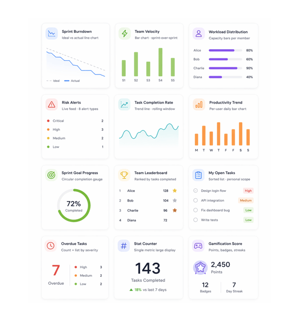 Sprint burndown, velocity, workload distribution, risk alerts, task completion rate, productivity trends, leaderboard, overdue tasks, epic progress, bottleneck summary, upcoming deadlines, team mood, and more all from the same data source, no integration required.