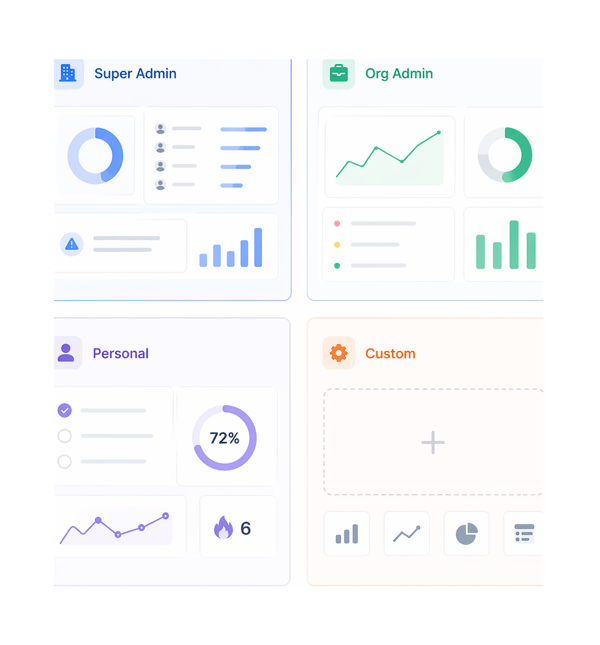 A Super Admin opening their dashboard sees org wide data. A developer sees their personal tasks and productivity trend. An Org Admin sees workload distribution and risk alerts. The right data for the right role without anyone configuring it manually from scratch.