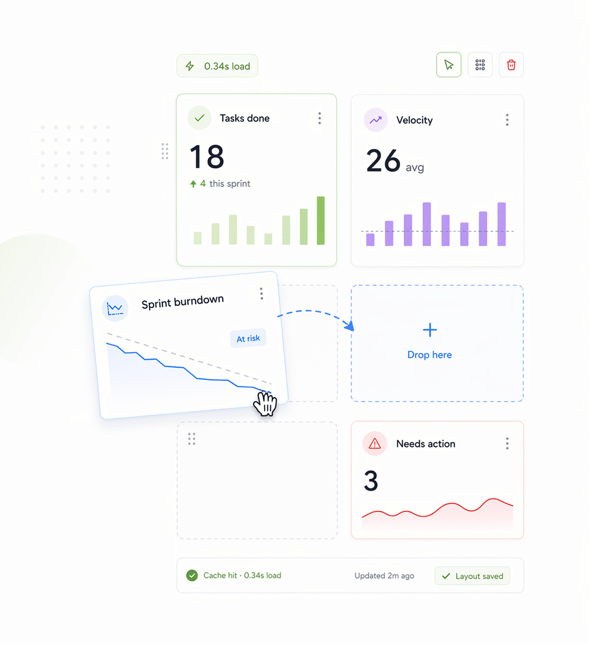 Every dashboard layout is fully customisable by drag and drop move widgets to any position, resize them to any width, remove ones you don't need, add new ones from the full library. Layouts are saved per user. Dashboard data is cached on every state change so the entire view loads in under one second regardless of workspace size no waiting for aggregation queries to run on open.