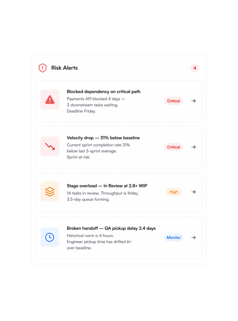 Blocked dependencies, velocity drops, single points of failure, stage overloads, stalled workflows, broken handoffs, overdue cascades, and completion prediction slips. Each alert names the specific task, person, or stage involved not a generic warning that something is wrong.