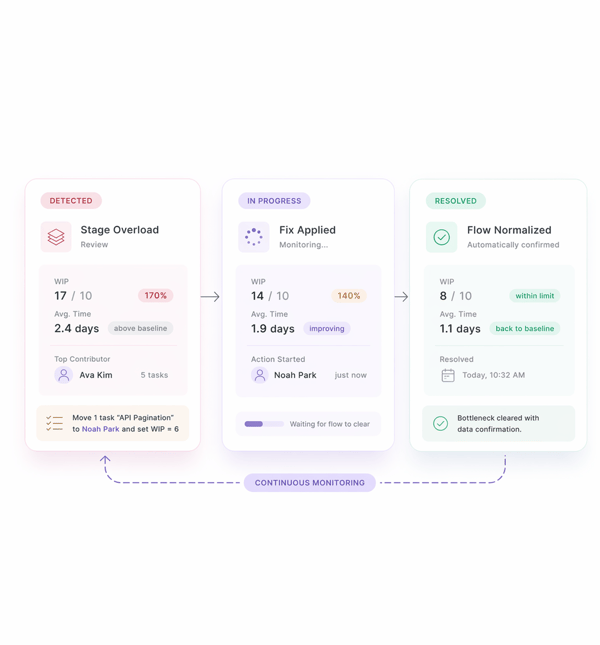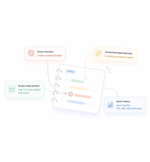 Tracks overdue tasks, stalled dependencies, and sprint velocity trends surfacing which tasks are most likely to slip before they actually do.