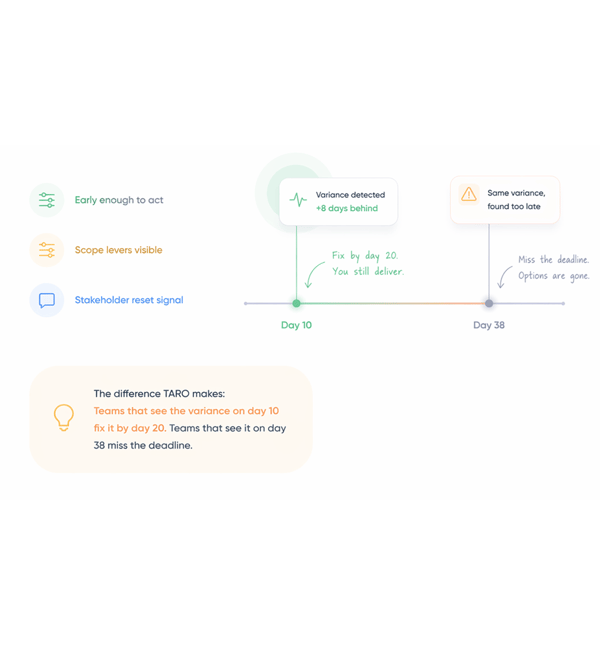 An 8 day variance discovered on week 2 of a 6 week project is recoverable. The same variance discovered the day before launch is not. TARO surfaces the variance the moment it becomes visible with enough runway to reduce scope, unblock tasks, add capacity, or reset the stakeholder expectation before it becomes a crisis.