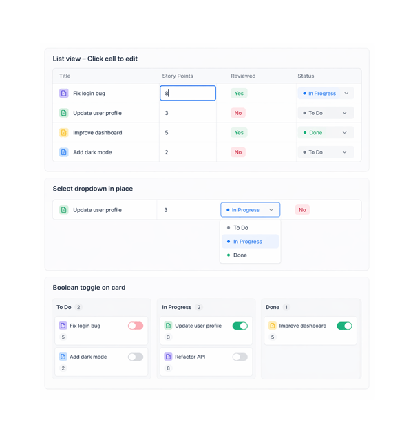 Custom field values are editable inline from any view click a List view cell and type, toggle a boolean directly on the Kanban card, pick a select option from a dropdown that appears in place. No one needs to open the full task detail panel to update a story point estimate or flip a review toggle. The field is where you see it. The edit is where you need it.