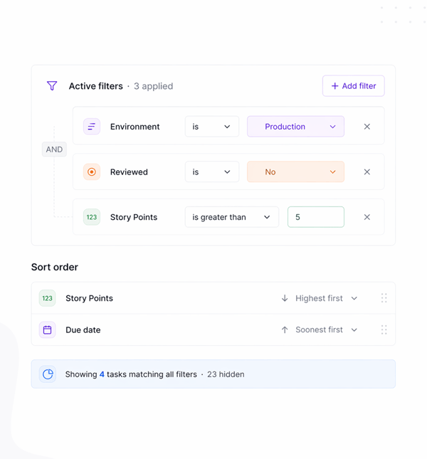 Once custom fields have values, they become full filter and sort criteria exactly like built in fields. Combine custom field filters with standard filters (status, assignee, priority) using AND logic. Sort ascending or descending on any field type. The result count updates as filters are applied so you always know how many tasks match before you commit.