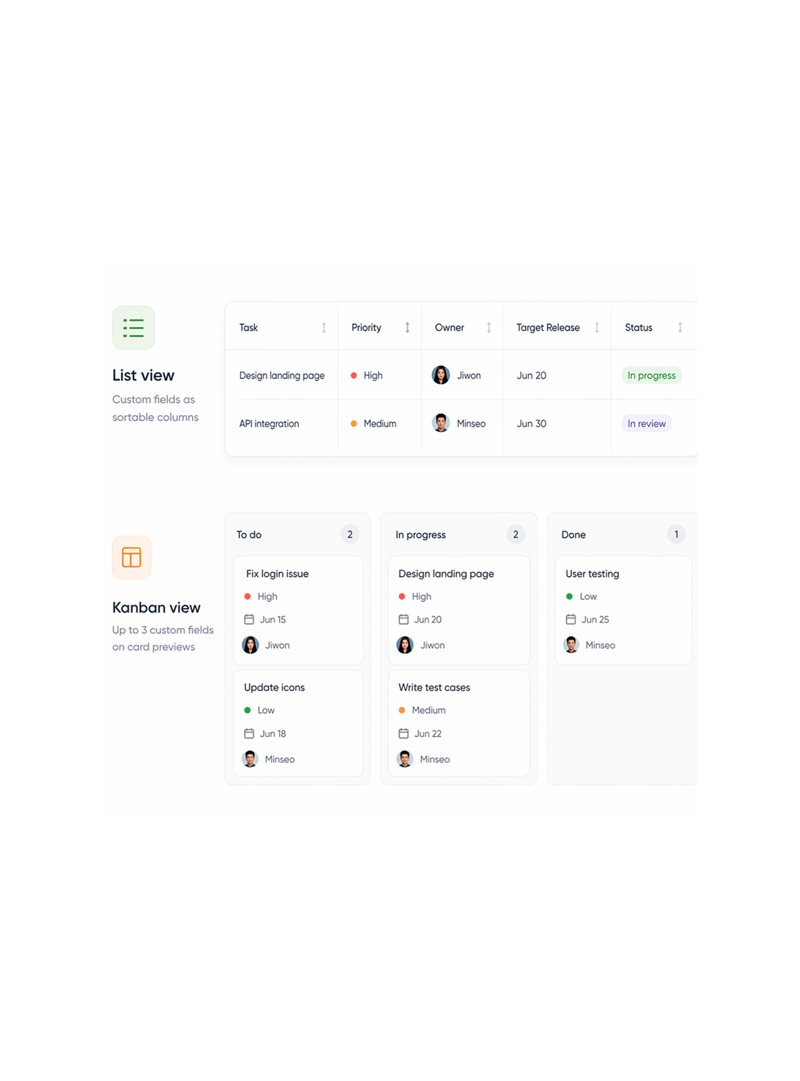 Configurable columns with card previews that show up to 3 custom fields alongside priority and assignee so the board tells the whole story without anyone opening a task.