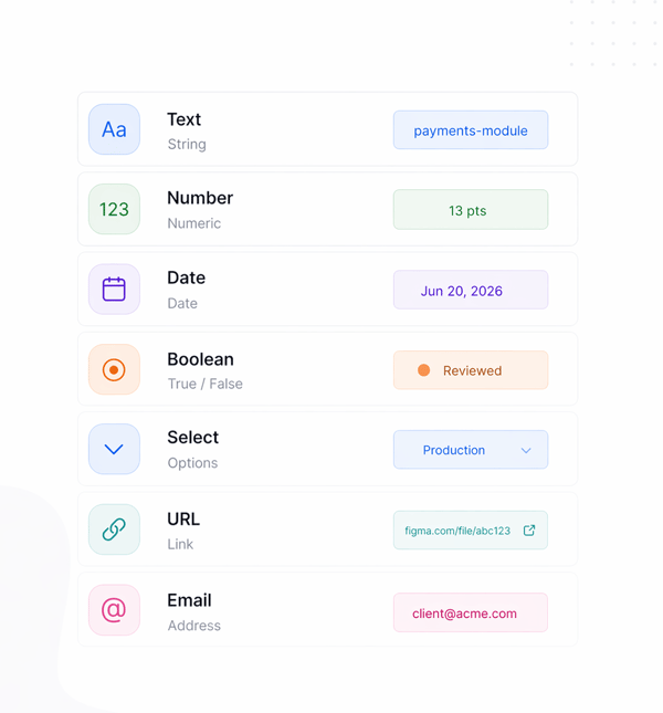 Text, number, date, boolean, select, URL, and email handle every kind of project specific information from story points to environment flags to client contact addresses without workarounds or type coercion.