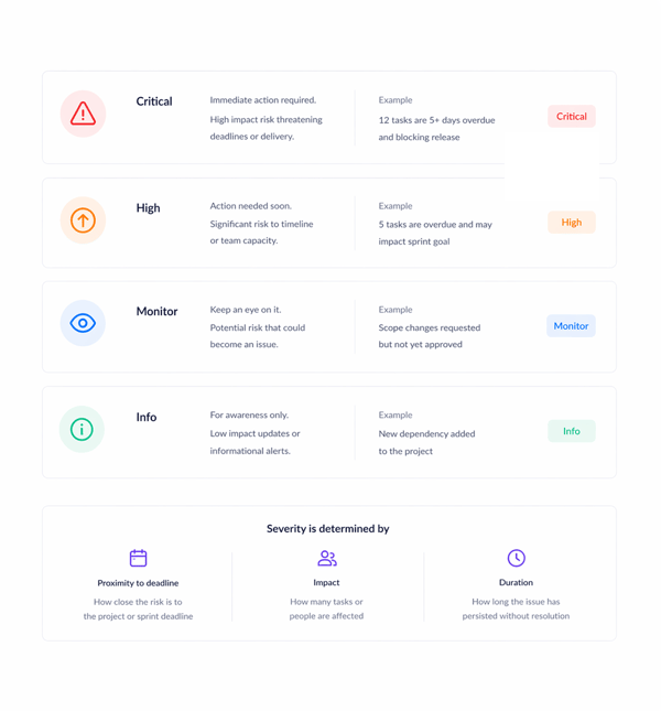 When everything is urgent, nothing is. Four severity levels Critical, High, Monitor, Info give teams a triage framework. Leads act on Critical immediately. They check High before end of day. They watch Monitor at standup. They review Info in retrospectives. Every alert gets the right response.