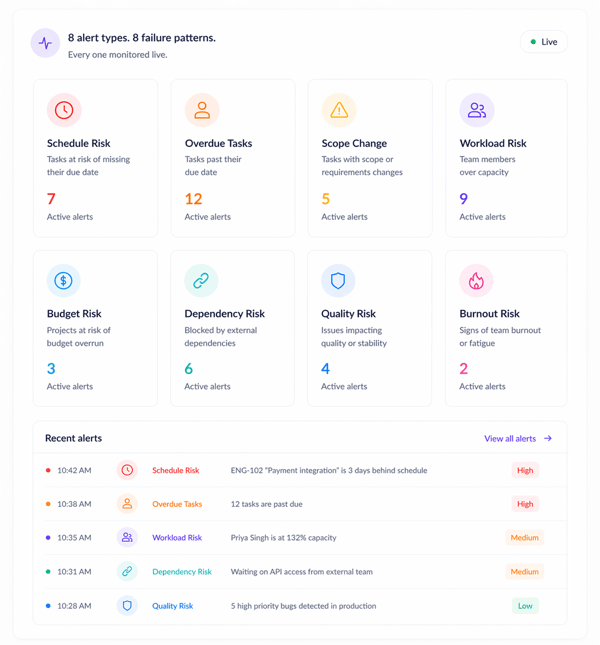 8 alert types monitored live overdue tasks, deadline risk, workflow bottleneck, inactive project, over budget, unassigned tasks, blocked tasks, and velocity decline each with severity levels that tell you exactly how urgently to act.
