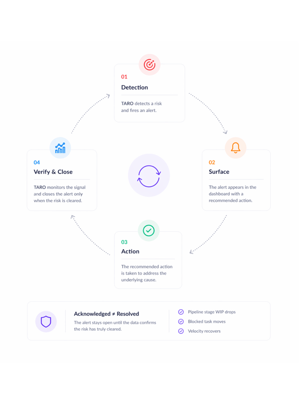Every alert in TARO follows a four-stage resolution loop. Detection fires the alert. The dashboard surfaces it with a recommended action. The action is taken a task unblocked, a reviewer added, a scope item deferred. TARO monitors the underlying signal and only closes the alert when the data confirms the risk has cleared. Acknowledging is not resolving. The alert stays visible until the pipeline stage WIP drops, the blocked task moves, or the velocity recovers.