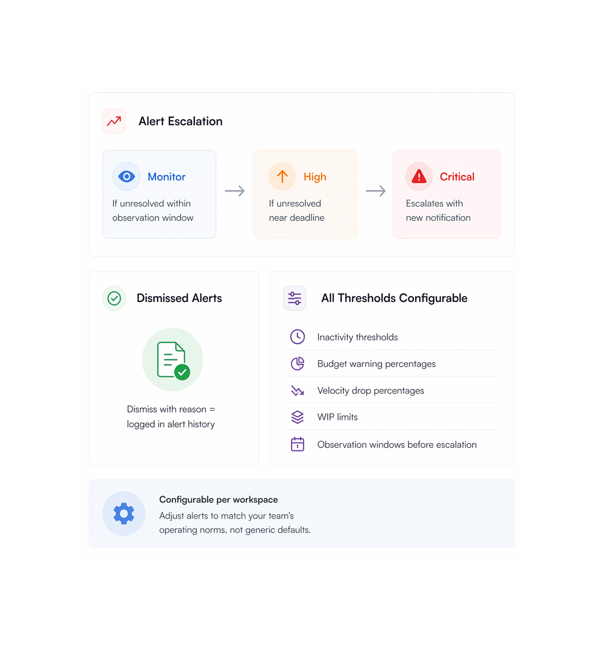 A velocity drop that's alarming for one team is routine variance for another. Every threshold inactivity days, budget warning percentage, velocity drop percent, WIP limits, escalation windows is configurable so TARO alerts on what's actually risky for how your team operates.