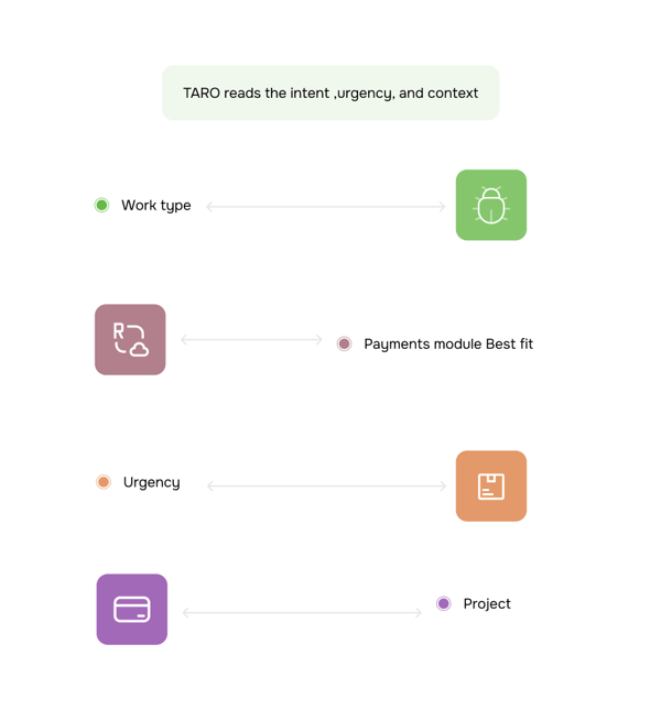 Before generating a single field, TARO analyses your input for four things: what type of work this is, how urgent it sounds, which project it belongs to, and who on the team is best placed to handle it. This analysis happens in the background you see nothing, you wait for nothing.