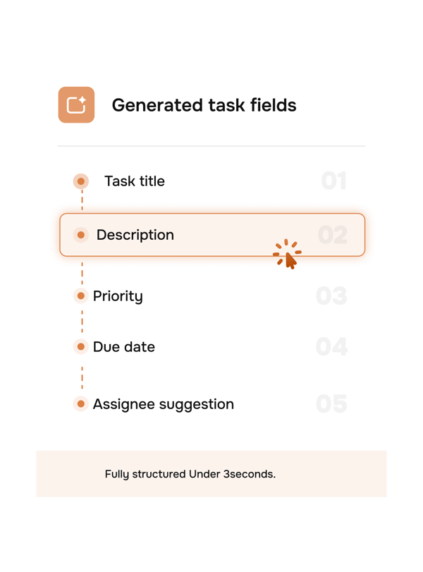 TARO creates a fully structured task title, description, priority, due date, and the right assignee in under 3 seconds. No forms, no clicks, no context switching.