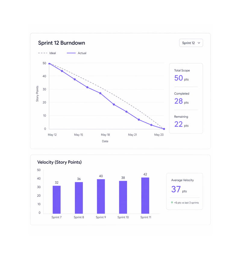 Velocity data, burndown charts, AI predictions. Run the sprint the way the numbers say it should go.