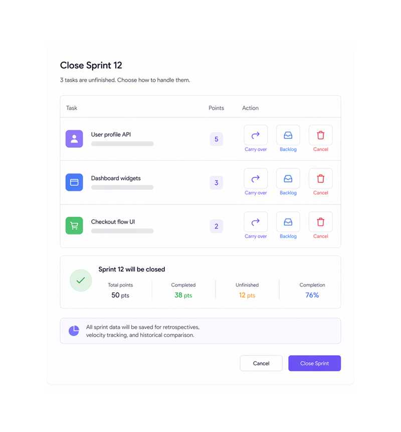 Every unfinished task at sprint close gets an explicit decision: carry forward, backlog, or cancel. Nothing silently disappears. Nothing accidentally gets committed to the next sprint without review. The carryover list is presented before the sprint closes so the team sees exactly what didn't make it.