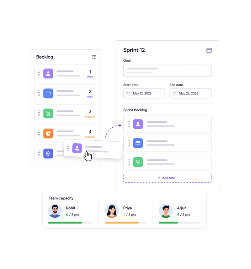 Full sprint lifecycle from planning to completion with task carryover. Burndown charts, velocity tracking, AI-powered workload balancing, and sprint completion prediction all in one place.