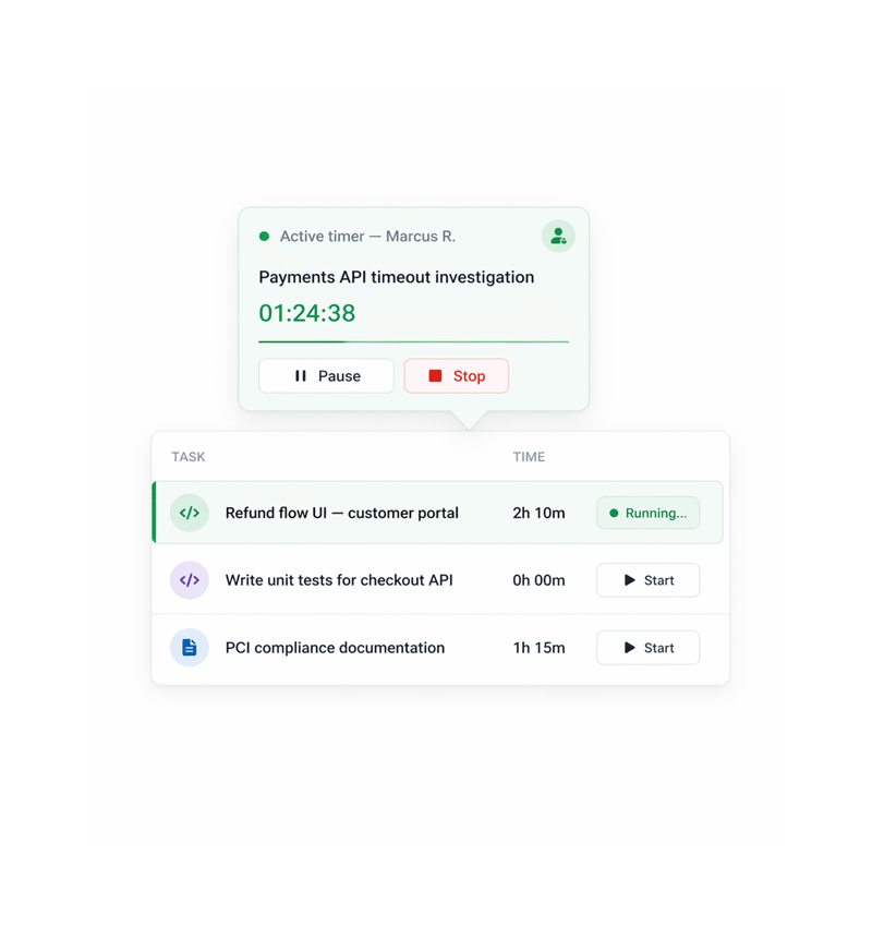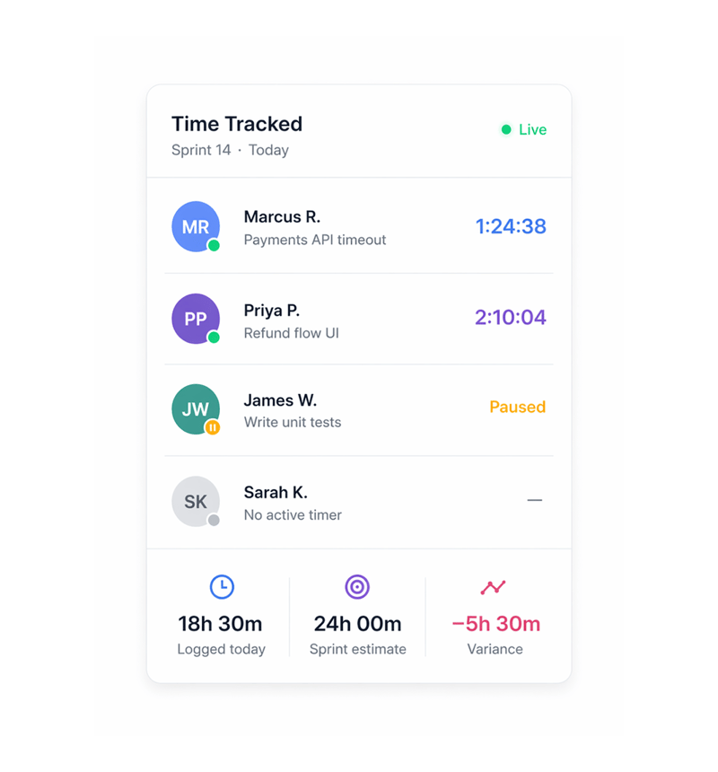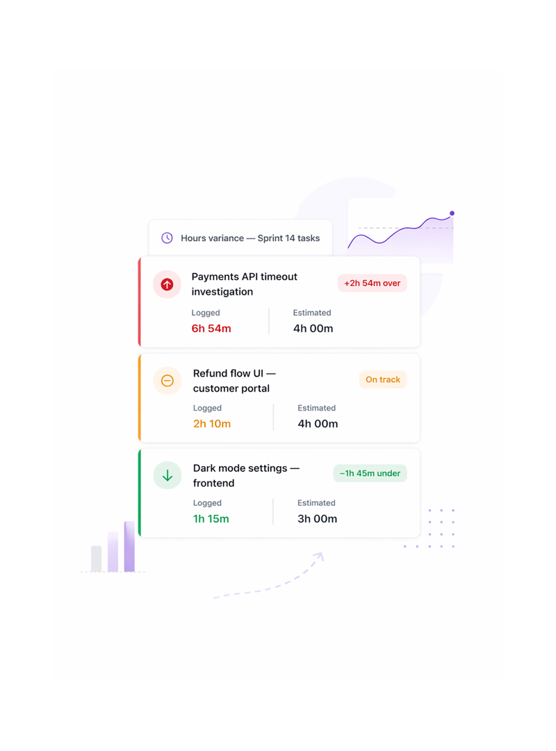 Engineering teams use variance data in retrospectives to calibrate future estimates. When the Payments API task was estimated at 4 hours and logged 6h 54m, that gap isn't a failure it's data. Next sprint the team estimates authentication work more accurately, commits to fewer tasks with confidence, and finishes sprints instead of carrying them over. Time tracking turns retrospective guesswork into estimation science.