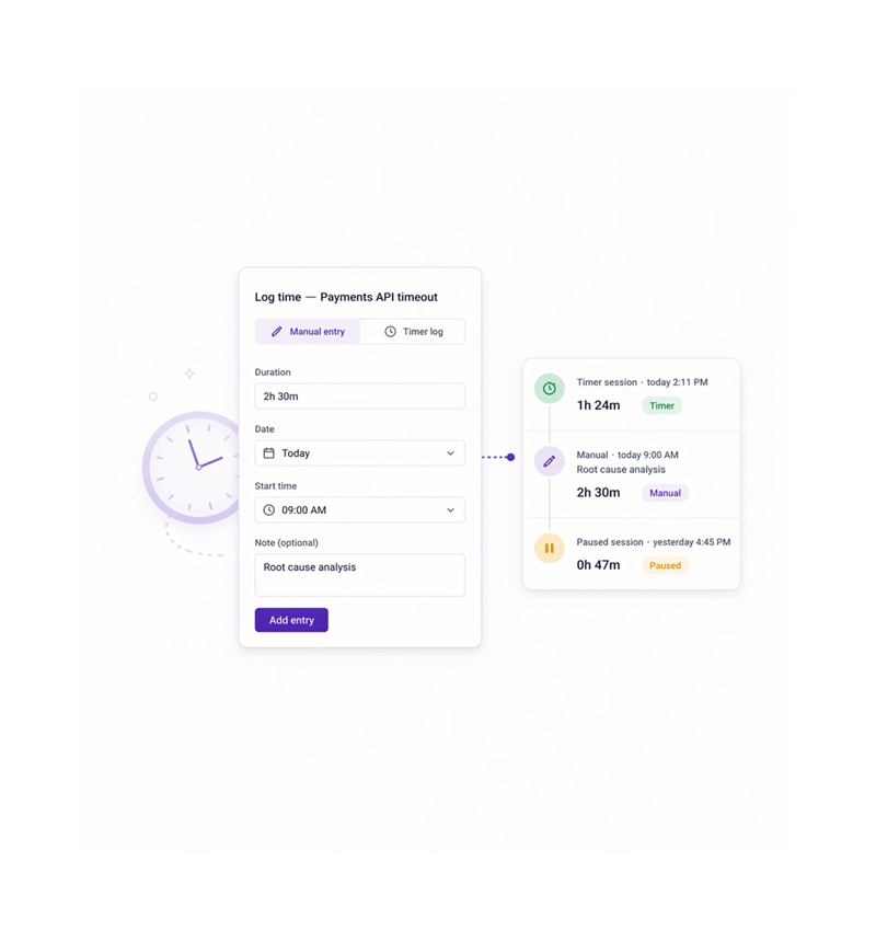 Not every work session starts with a timer click. Calls, planning, deep work that started before the laptop opened all of it can be logged manually with a duration, date, start time, and note. The log marks it as manual so the audit trail stays honest.