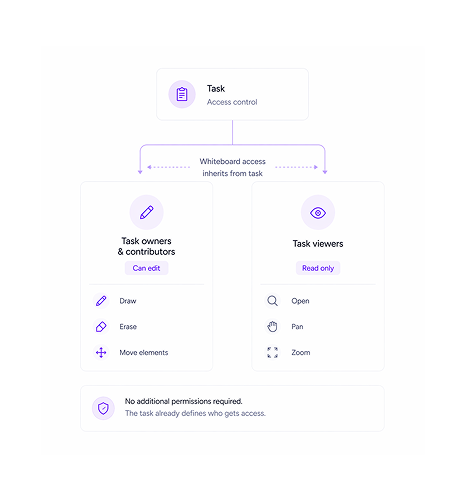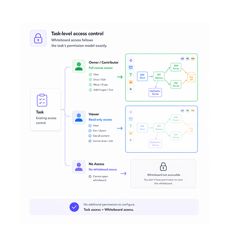 Whiteboard access is not a separate permission to configure. It inherits directly from the task's existing access control whoever can view or edit the task can view or edit the whiteboard. Task owners and contributors can draw and modify the canvas. Task viewers see the whiteboard in read only mode they can open the canvas, pan, zoom, and see all content, but cannot draw, erase, or move elements. This means the whiteboard needs zero additional access configuration: the task already defines who gets in.