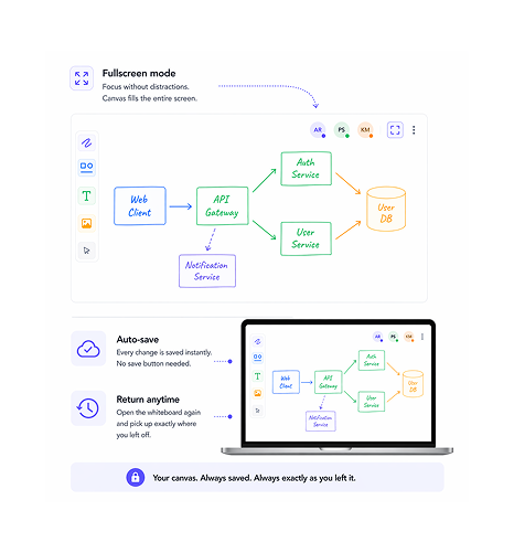 Every stroke is persisted immediately. There is no save button, no unsaved state, and no "do you want to save before closing?" prompt. A mid session crash, an accidental tab close, a network hiccup none of them lose a single element from the canvas.