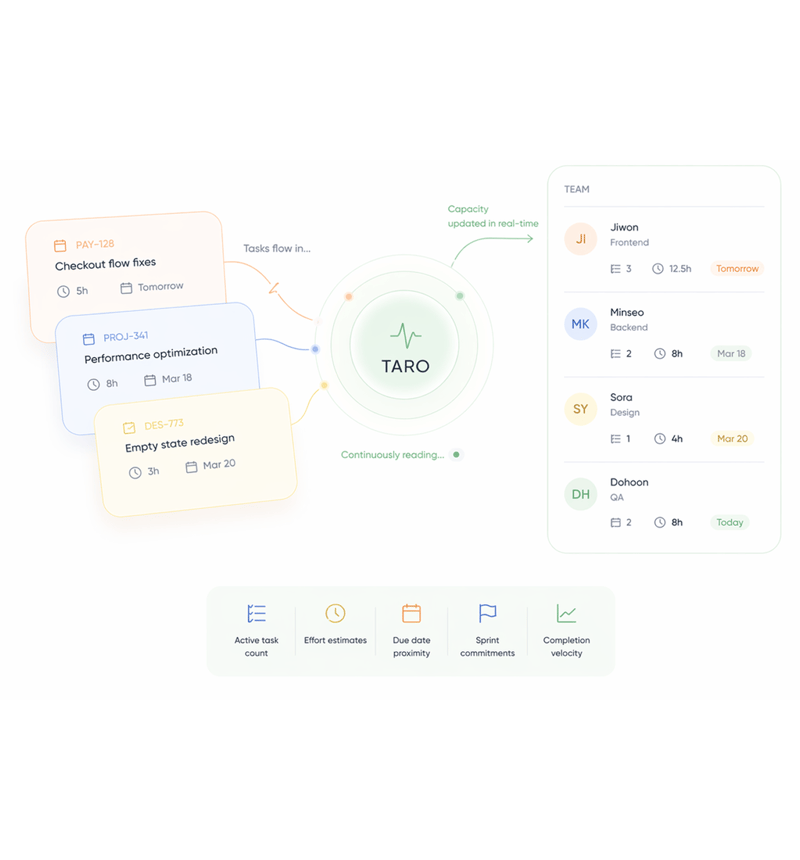 TARO maintains a live view of every team member's active task count, estimated effort, due dates, and sprint commitments simultaneously. It's not a snapshot taken at sprint planning it's a continuous read that updates every time a task is added, moved, or completed.