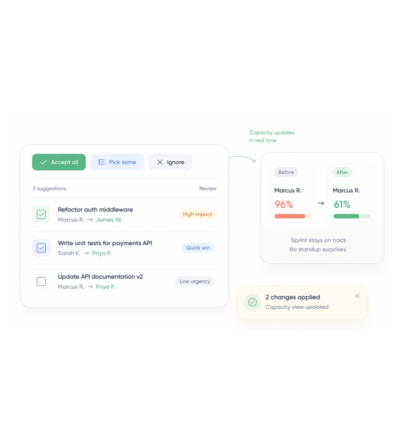 No nothing moves without your approval. TARO surfaces suggestions and waits for a human decision. You can accept all suggestions in one click, accept individual ones, or dismiss the entire set. This is intentional: workload decisions involve context that TARO doesn't always have team dynamics, upcoming leave, undocumented priorities. TARO brings the data; the lead makes the call. If you want to accept all suggestions in one click after reviewing them, you can but the click is always yours to make.